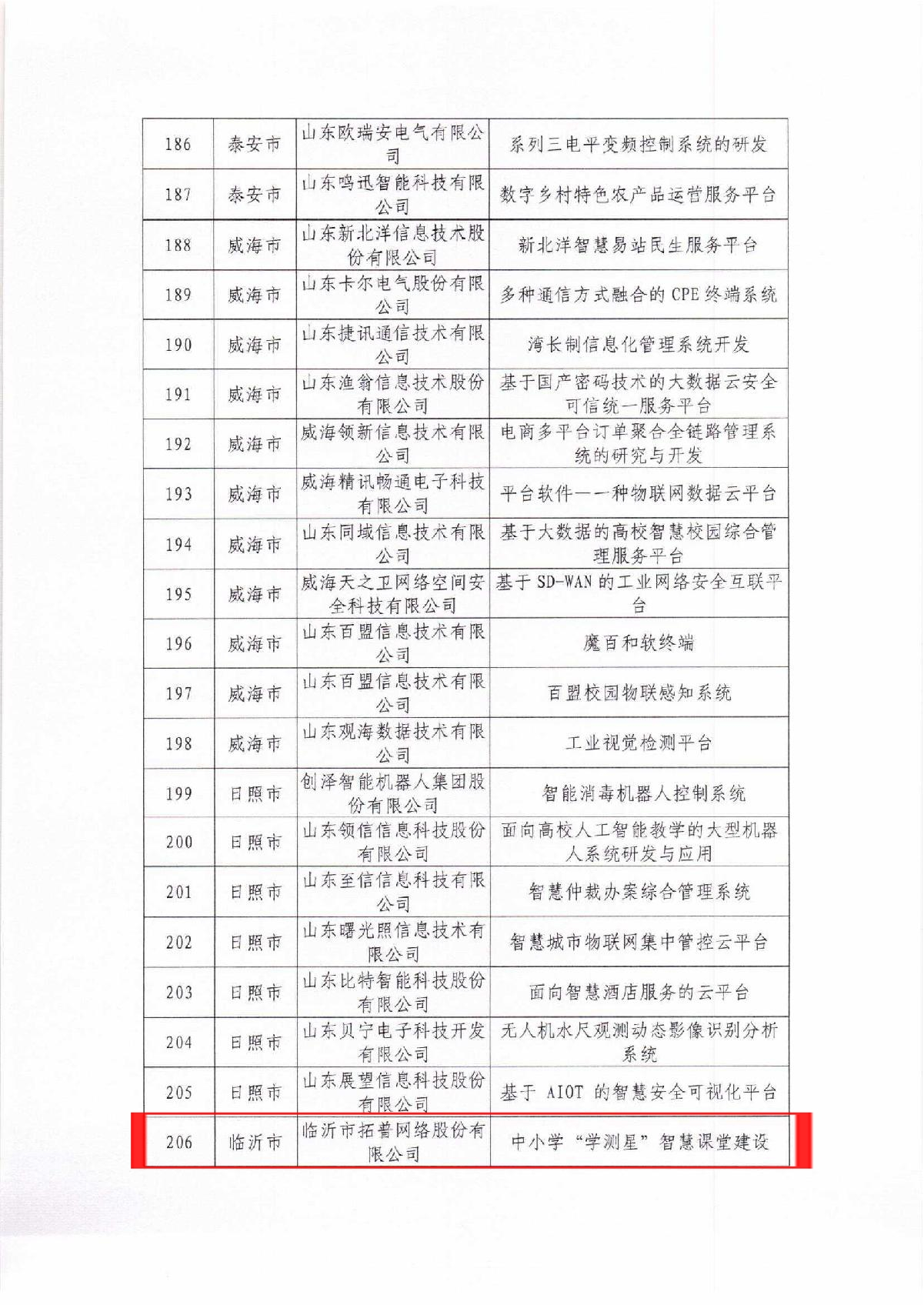 2021年6月2日,山東省工信廳公布了山東省軟件產(chǎn)業(yè)高質(zhì)量發(fā)展重點(diǎn)項(xiàng)目名單,臨沂市拓普網(wǎng)絡(luò)股份有限公司的中小學(xué)“學(xué)測(cè)星”智慧課堂建設(shè)項(xiàng)目入選。