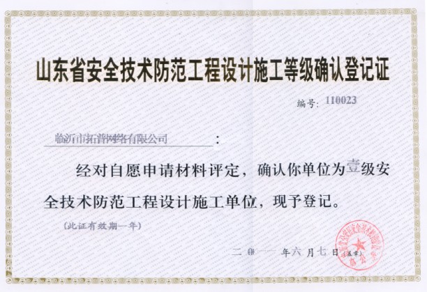 2011年6月7日,經山東省濟南市公安局技術防范辦公室對我公司材料評定,確認我單位為一級安全技術防范工程設計施工單位,并予以頒發(fā)《山東省安全技術防范工程設計施工等級確認登記證》。 山東省安防一級資質證書的獲得,說明公司將安全技術防范工程設計施工與傳統(tǒng)優(yōu)勢的網絡安全及軟件等業(yè)務進一步有機結合,使公司的業(yè)務體系更加完善,為用戶提供更加全面、可靠、安全、優(yōu)質的整體解決方案。這標志著公司在安防系統(tǒng)業(yè)務拓展達到了新的高度,是公司工程服務能力的一次質的飛躍。 附:
