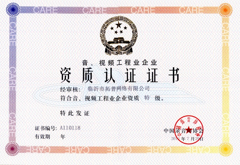 2011年7月29日,經中國錄音師協(xié)會對我公司上報的材料審核,評定我公司為音、視頻工程業(yè)企業(yè)特級資質,并予以頒發(fā)工程業(yè)企業(yè)特級資質認證證書。 音、視頻工程業(yè)企業(yè)特級資質的獲得,使公司在魯南地區(qū)同行業(yè)施工資質水平站在最前列。這將大大提高我公司的市場綜合競爭能力和企業(yè)信用等級,公司可以為合作單位提供更為優(yōu)質的服務,為今后數(shù)年的大發(fā)展打下了堅實的基礎。 特級資質的獲得,是公司發(fā)展的又一新的里程碑,消息傳來,公司各崗位員工倍感振奮與自豪,紛紛表示要以更大的工作熱情、更高的工作效率、更強的敬業(yè)精神開展工作,充分利用好這一發(fā)展平臺,再接再厲、奮發(fā)有為,在今后數(shù)年時間里推動企業(yè)取得跨越式發(fā)展、為社會打造更多的精品工程!