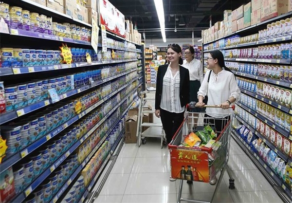 5月12日,在山東省臨沂經(jīng)濟技術(shù)開發(fā)區(qū)東方購物超市,瑪麗娜(左一)與同事劉相艷(右一)一起購物。來自烏克蘭的瑪麗娜于2014年來到山東省臨沂市拓普網(wǎng)絡(luò)股份有限公司工作。