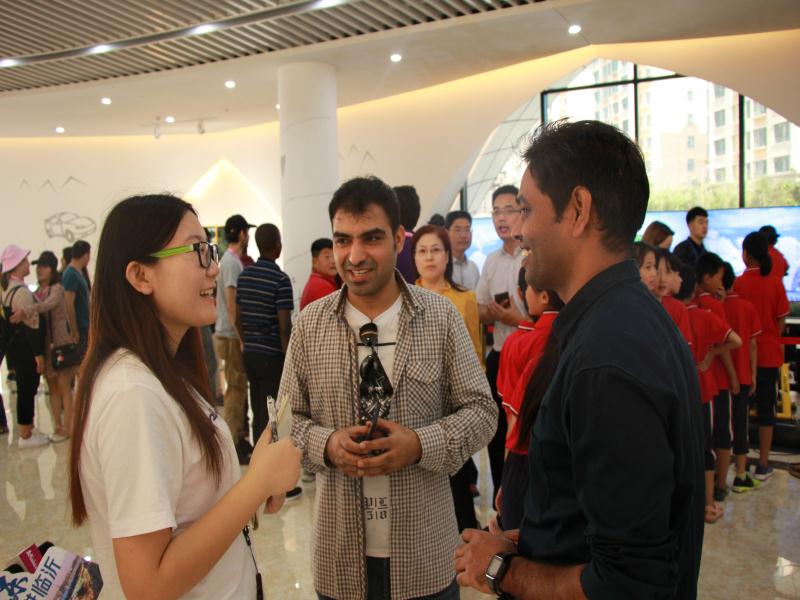 隨后,在中印專家隊伍的帶領下,留學生們來到了創(chuàng)客中心。無巧不成書,一支來自臨沂市的小學生隊伍正在創(chuàng)客中心內(nèi)進行綜合實踐,兩支隊伍隨即展開了熱切的交流,并共同體驗創(chuàng)客中心內(nèi)的各個項目。整個上午,蓮花狀的山東智慧教育創(chuàng)客中心內(nèi),充滿了來自五湖四海不同膚色的小朋友和大朋友們的歡聲笑語。