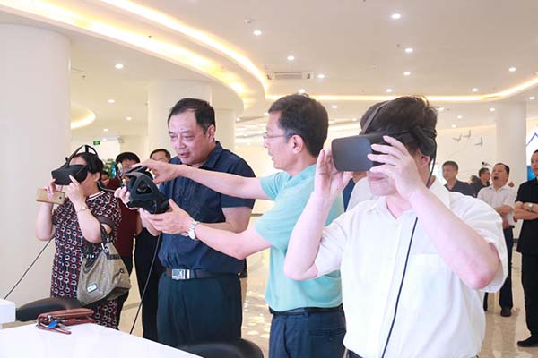 (考察團(tuán)體驗(yàn)VR設(shè)備) 考察團(tuán)一行在公司董事長王嵐保的陪同下先后參觀了一樓展廳的研發(fā)中心、臨沂市大數(shù)據(jù)中心、山東智慧教育信息化應(yīng)用能力培訓(xùn)基地、山東省智慧教育創(chuàng)客活動中心等地。