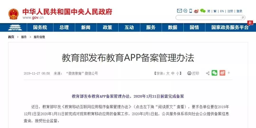 2019年11月,教育部印發(fā)《教育移動(dòng)互聯(lián)網(wǎng)應(yīng)用程序備案管理辦法》,要求2020年1月31日前完成對(duì)現(xiàn)有教育移動(dòng)應(yīng)用的備案工作。