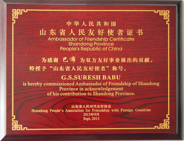 | 熱烈祝賀公司印度專家BABU榮獲“山東省人民友好使者”稱號 |