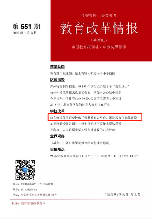 近日,教育部主管的國家級內(nèi)參《教育改革情報》以《依托智慧教育云平臺,推進學(xué)校教育信息化建設(shè)》為題原文刊發(fā)教育科學(xué)專欄,對臨沂外國語學(xué)校依托智慧教育云平臺、推進學(xué)校教育信息化建設(shè)的經(jīng)驗及做法進行了宣傳報道。