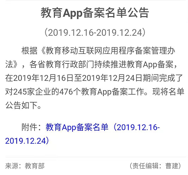 2019年11月,教育部印發(fā)《教育移動(dòng)互聯(lián)網(wǎng)應(yīng)用程序備案管理辦法》,要求2020年1月31日前完成對(duì)現(xiàn)有教育移動(dòng)應(yīng)用的備案工作。