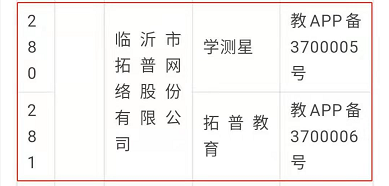 根據(jù)《教育移動(dòng)互聯(lián)網(wǎng)應(yīng)用程序備案管理辦法》,各省教育行政部門持續(xù)推進(jìn)教育App備案。1月2日,國家教育部正式公布了第二批教育App備案名單,476個(gè)教育APP完成備案。名單顯示,臨沂市拓普網(wǎng)絡(luò)股份有限公司旗下“學(xué)測(cè)星”和“拓普教育”產(chǎn)品全部過審。