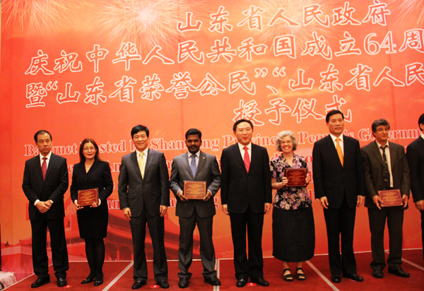 9月29日,中華人民共和國成立64周年招待會暨“山東省榮譽公民”“山東省人民友好使者”授予儀式在濟南舉行,副省長夏耕出席并致辭,并對10位獲得“山東省榮譽公民”和30位獲得“山東省人民友好使者”榮譽稱號的外國友人進行了表彰,公司印度專家BABU先生被授予“山東省人民友好使者”稱號。 ![]() 頒獎現(xiàn)場 ![]() 山東省人民友好使者證書