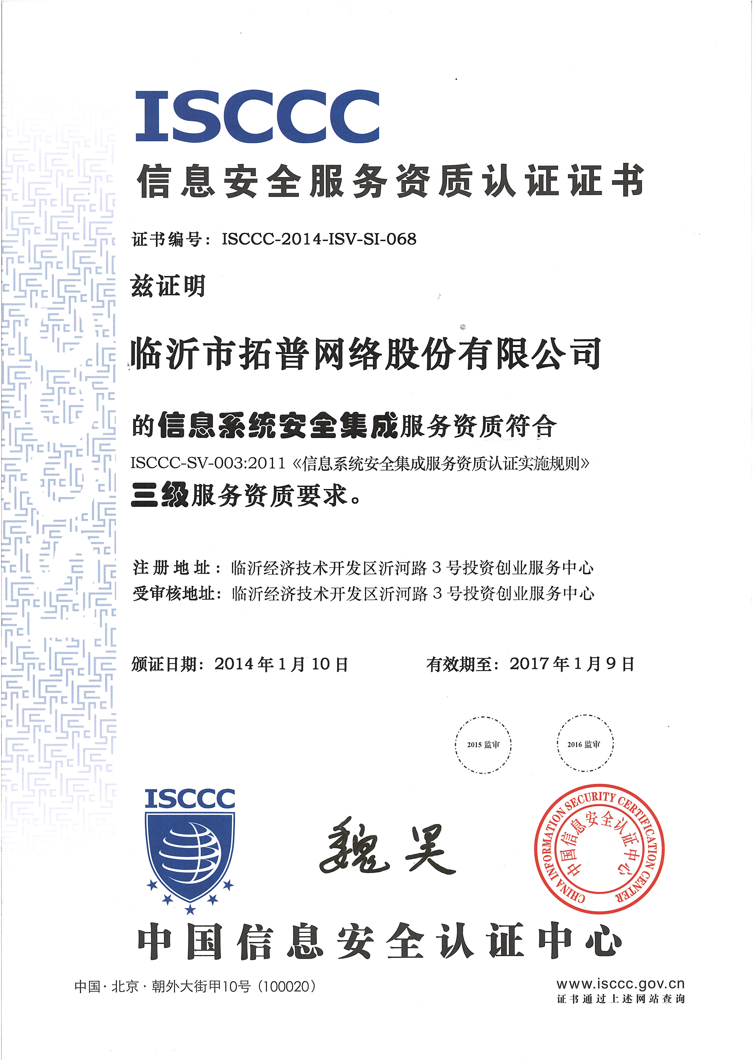 | 熱烈祝賀公司榮獲“ISCCC信息安全服務(wù)資質(zhì)認(rèn)證證書” |