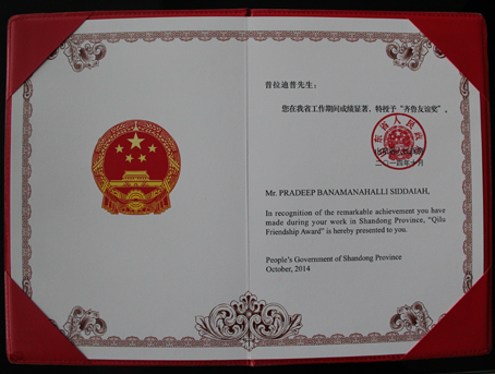 2014年11月12日,山東省人民政府在濟(jì)南隆重舉行2014年度“齊魯友誼獎(jiǎng)”頒獎(jiǎng)儀式,公司印度專(zhuān)家普拉迪普獲此殊榮,山東省委常委、常務(wù)副省長(zhǎng)孫偉、國(guó)家外國(guó)專(zhuān)家局副局長(zhǎng)劉延國(guó)分別為其頒發(fā)了獎(jiǎng)?wù)?、證書(shū)。