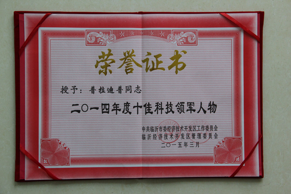 2015年3月9日,臨沂經(jīng)濟(jì)技術(shù)開(kāi)發(fā)區(qū)領(lǐng)導(dǎo)干部大會(huì)隆重召開(kāi),市人大常委會(huì)副主任、開(kāi)發(fā)區(qū)黨工委書(shū)記徐福田出席會(huì)議并作重要講話(huà),大會(huì)表彰了2014年創(chuàng)業(yè)功臣、功勛企業(yè)、科技創(chuàng)新先進(jìn)單位等先進(jìn)個(gè)人、先進(jìn)集體,其中,公司印度專(zhuān)家普拉迪普榮獲“十佳科技領(lǐng)軍人物”。