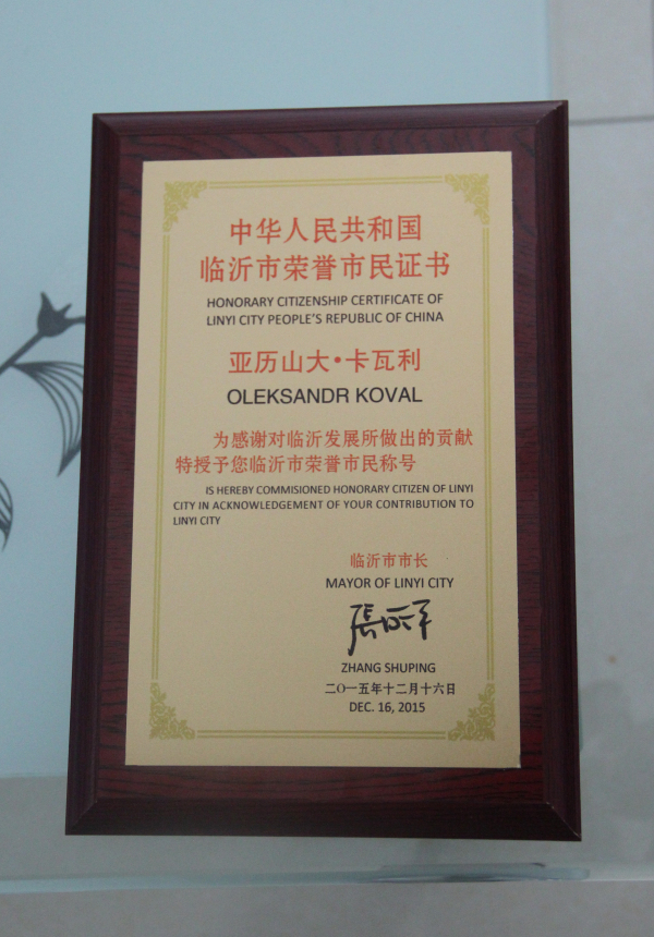 | 祝賀公司烏克蘭亞歷山大·卡瓦利博士榮獲“臨沂市榮譽(yù)市民”稱號(hào) |