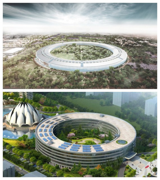蘋(píng)果公司正在其加州總部附近建設(shè)名為“太空船”的新園區(qū)大樓,這個(gè)引領(lǐng)世界科技潮流的公司展示給世界的“最具科技感”建筑,卻被眼尖人士發(fā)現(xiàn)它和我公司建設(shè)的中印軟件產(chǎn)業(yè)園極為神似。