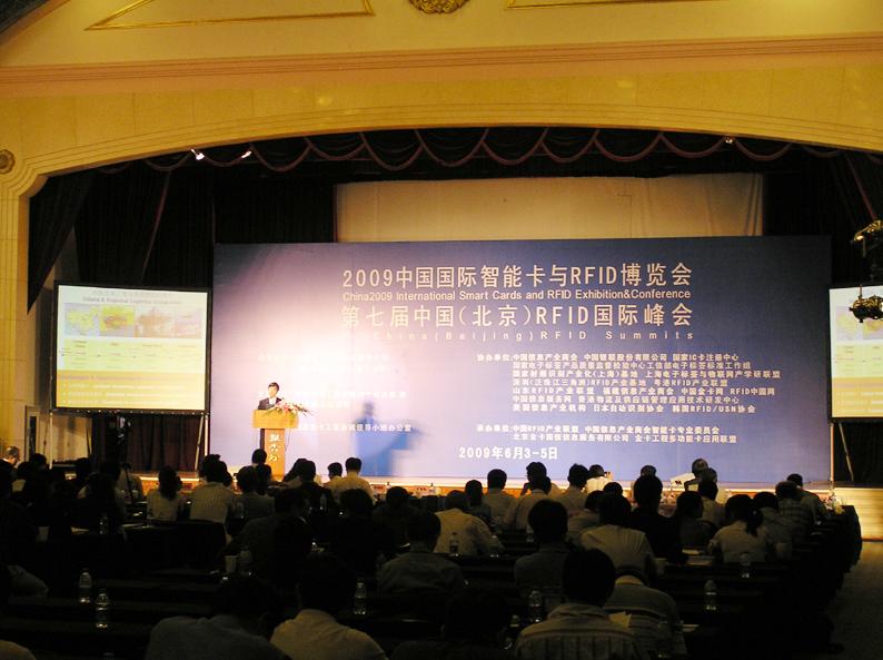 北京展覽館 會議日程 相關(guān)論壇 ![]() 國家金卡辦主任、中國RFID產(chǎn)業(yè)聯(lián)盟理事長張琪致開幕詞 2009年6月3日至5日,公司參加了2009中國國際智能卡與RFID博覽會和第七屆中國(北京)RFID國際峰會。這次展會共有來自中國(兩岸三地)、英國、德國、日本、韓國、新加坡等國家的約150家智能卡和電子標簽(RFID)相關(guān)企業(yè)參展,總計約600人參加了開幕式。
